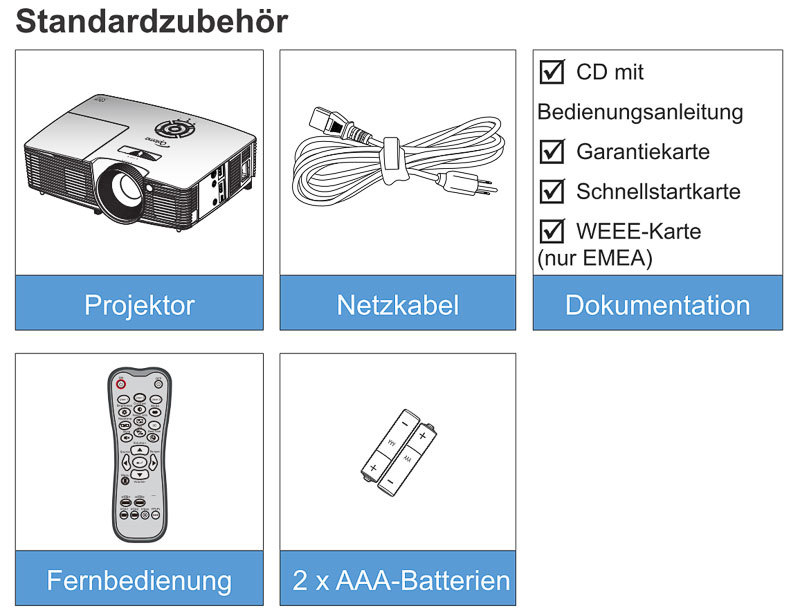 Der Lieferumfang des GT1080 enthält alles, um jederzeit auch für einen mobilen Einsatz gerüstet zu sein. Dazu zählen: der Projektor mit Objektivschutzdeckel, eine Fernbedienung, ein Netz- und ein HDMI-Kabel, sowie eine praktische Tragetasche, in der alles sicher verstaut werden kann. Eine Quickstartanleitung liegt in gedruckter Form bei, das Handbuch befindet sich in elektronischer Form auf der CD.