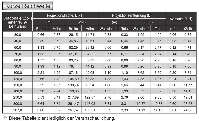 Die folgende Distanztabelle zeigt die Aufstellungsmöglichkeiten detailliert für eine Projektion im 16:9 -Format.