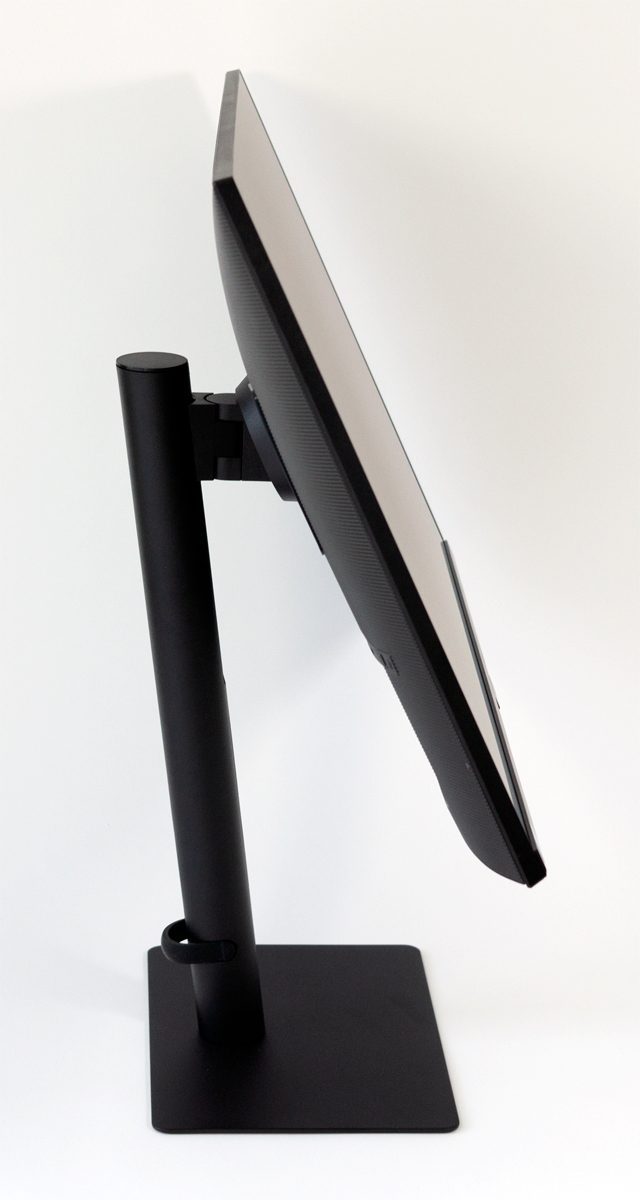 Das Standbein ermöglicht eine Höhenverstellung um 11,5 cm (12 cm laut Spezifikation). In der höchsten Stellung beträgt der Abstand vom unteren Rahmen bis zur Schreibtischplatte 18,5 cm. Bis zur tiefsten Stellung sind es 7 cm. Das Display kann um 30° nach links und rechts gedreht werden. Die Drehung erfolgt über die im Standfuß integrierte Funktion. Der Standfuß dreht dabei nicht mit. Der Neigungswinkel kann von – 2° bis 25° justiert werden.
