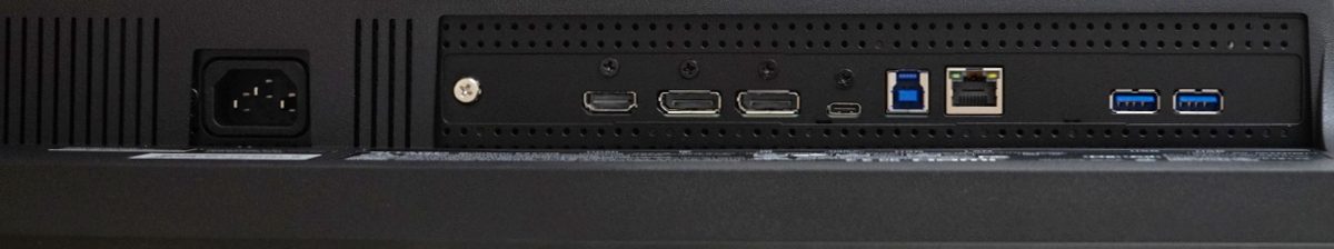 Im Anschluss-Panel (von links nach rechts) befinden sich folgende Schnittstellen: Stromanschluss, HDMI, DisplayPort 1.4 (Eingang), DisplayPort 1.4 (Ausgang), USB-C (DP-Alt-Mode und 90 W Power Delivery), USB 3.1 (Up), RJ-45 (1 Gbit/s) und 2 x USB 3.1 (Down).