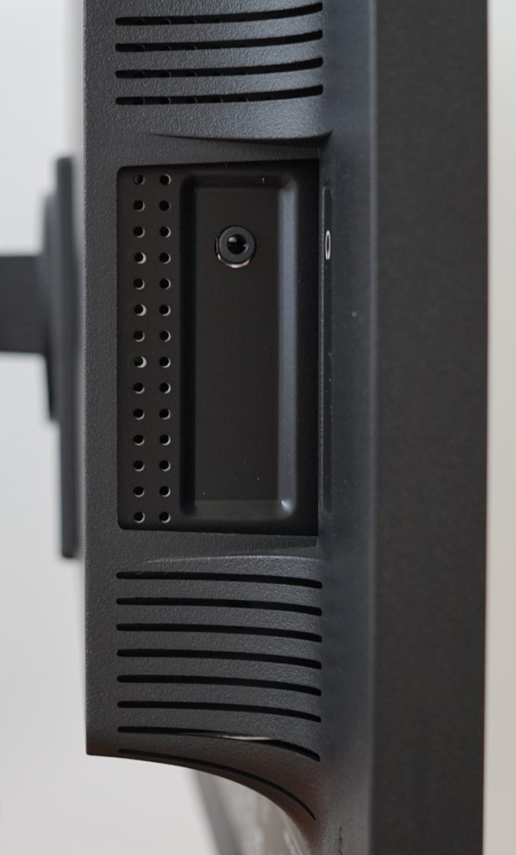 Der Standfuß muss noch mit dem Standbein verbunden werden. Das geschieht völlig werkzeuglos mit einer Flügelschraube. Das Standbein kann demontiert werden, und das Display bietet dann eine VESA-100-Montagemöglichkeit für alternative Lösungen.