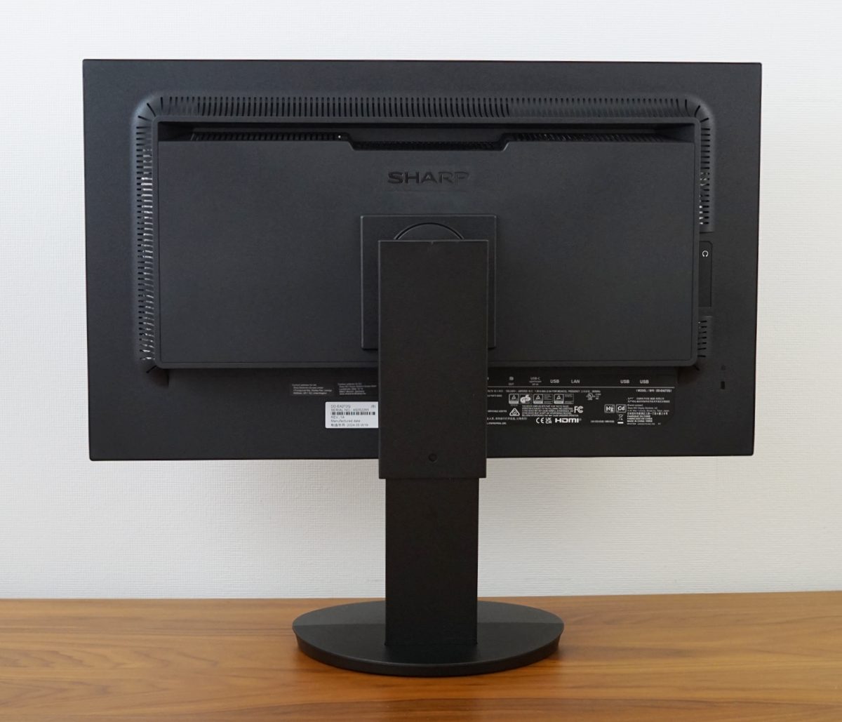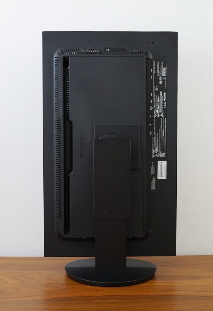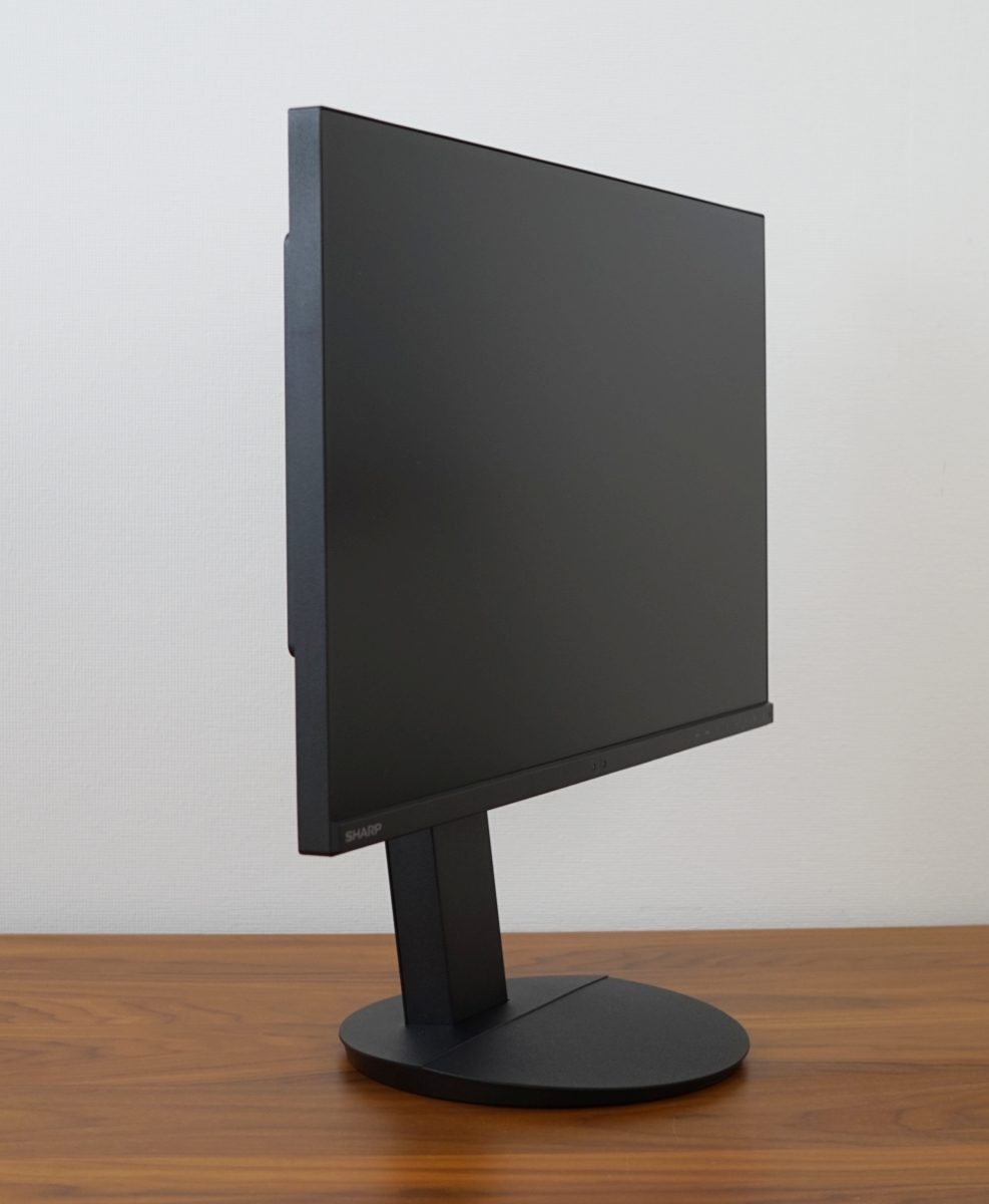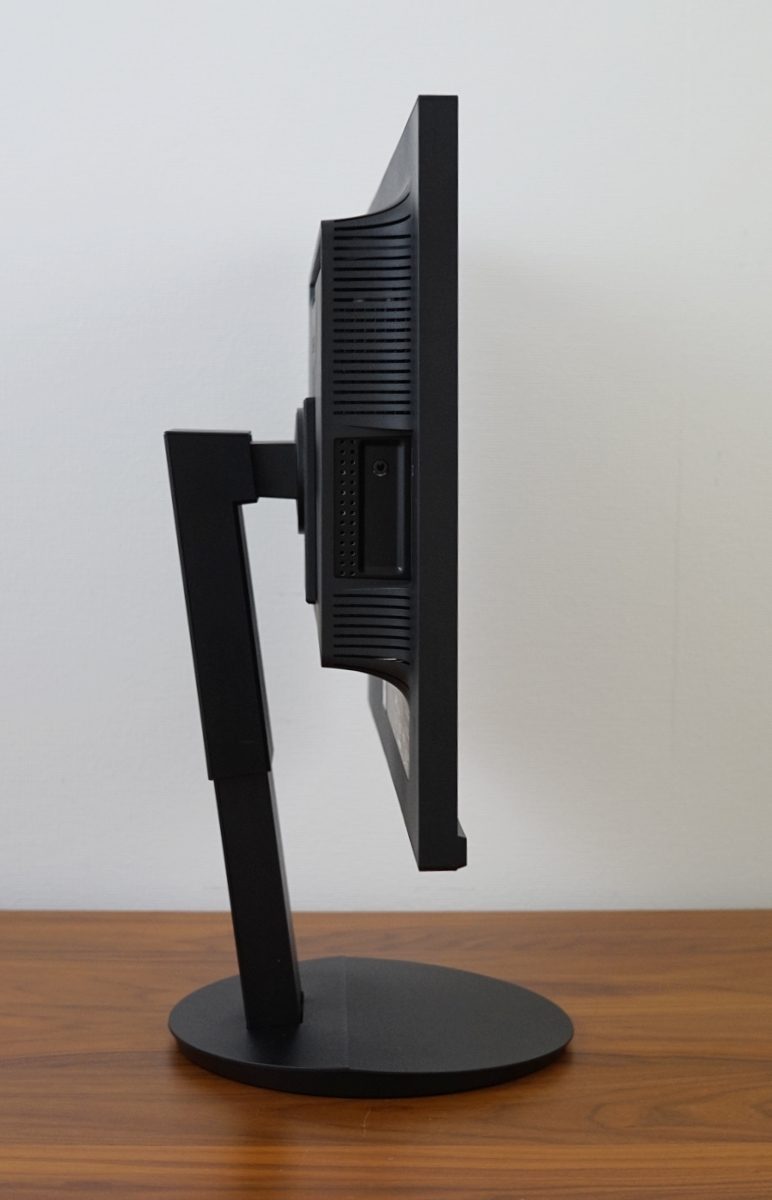 Das Standbein des Sharp EA272Q ermöglicht eine Höhenverstellung von bis zu 15 cm. In der höchsten Einstellung beträgt der Abstand vom unteren Rahmen bis zur Schreibtischplatte 17 cm, während es in der niedrigsten Einstellung etwa 2 cm sind. In der untersten Stellung liegt der Rahmen des Monitors auf dem Standfuß auf. Die Mechanik ist zwar angenehm leichtgängig, verursacht beim Justieren aber doch einige schabende Geräusche. Das Display kann um 340° praktisch einmal um die komplette Achse gedreht werden. Die Drehung erfolgt durch eine auf der Unterseite angebrachte Drehscheibe. Die Umsetzung ist ausgezeichnet gelungen. Der Fuß dreht zwar mit, da er aber rund ist, wird kein zusätzlicher Platz benötigt.