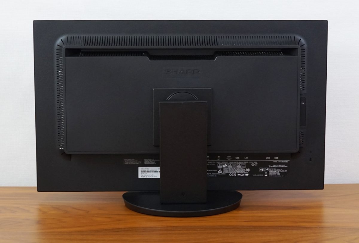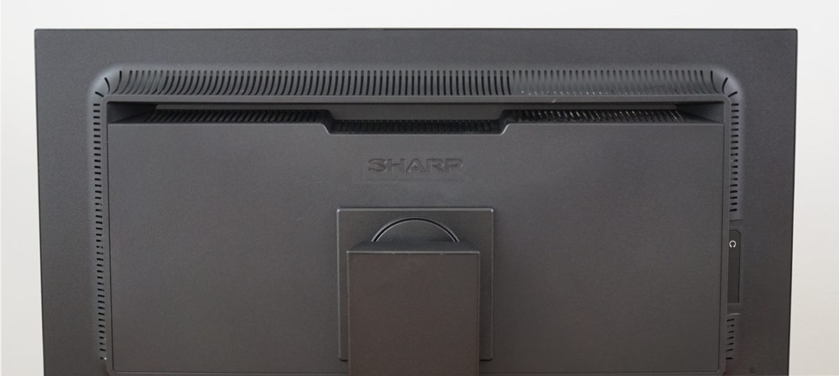 Der Sharp EA272Q besitzt ein internes Netzteil. Im oberen Bereich des Rahmens befinden sich Lüftungsschlitze, allerdings erwärmt sich der Monitor kaum. Oberhalb des Sharp-Logos ist eine Griffmulde positioniert, mit der das Display bequem transportiert werden kann.