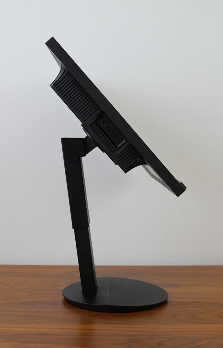 Der Neigungswinkel des Bildschirms kann von -5° bis +35° justiert werden. Zusätzlich ist eine 90°-Drehung in den Porträtmodus (Pivot) möglich, und zwar nach links und rechts. Das OSD kann je nach Variante ebenfalls mitgedreht werden. Allerdings muss das Display etwas nach hinten geneigt werden, da sonst die Ecke des Rahmens mit dem Standfuß kollidiert. Eine Höhenverstellung ist noch um 3 cm möglich, in der tiefsten Stellung liegt das Gehäuse auf dem Standfuß auf. Für eine perfekte horizontale Ausrichtung muss der Sharp EA272Q manuell nachjustiert werden.
