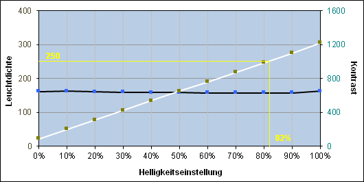 Mit dem Helligkeitsregler kann die Helligkeit stufenlos eingestellt werden, eine Skala oder einen Wert neben der Balkenanzeige gibt es nicht. Am unteren Ende des Balkens ist das Display ziemlich dunkel, mit 23 cd/m² wird man nicht viel anfangen können. Brauchbare Helligkeiten um 150 cd/m² beginnen in der Mittelstellung. Für unsere Referenzhelligkeit von 250 cd/m² sind schon 82 Prozent des Reglerbalkens nötig.