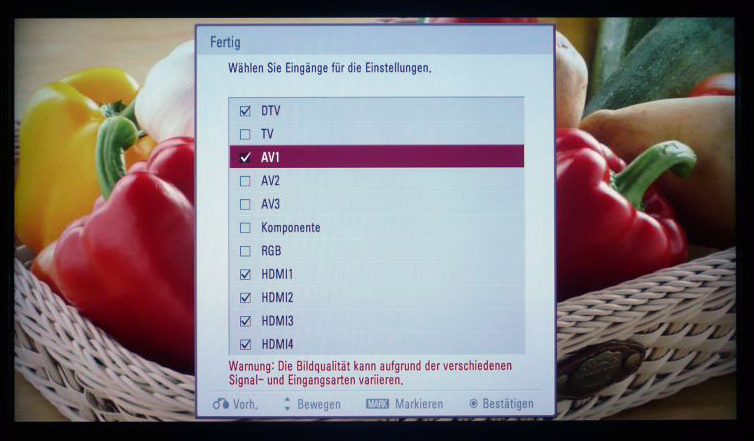 Hier lassen sich alle Signalquellen direkt bequem durchschalten. Quellen, die nicht angeschlossen sind, werden grau, die angeschlossenen schwarz hinterlegt.