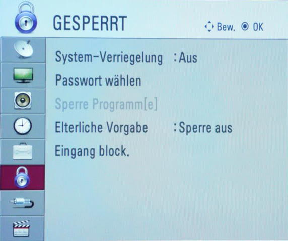 Optionen um den Fernseher vor Manipulation oder unbefugten Benutzern zu schützen.