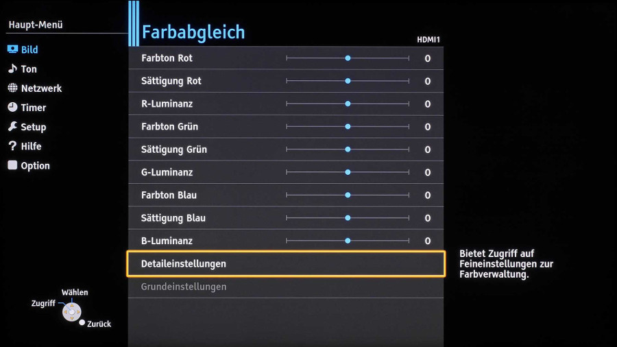 Glücklicherweise wird das Hauptmenü nicht allzu oft benötigt. Nichtsdestotrotz können anspruchsvolle Nutzer wegen der zahlreichen Einstellmöglichkeiten darin recht viel Zeit verbringen; zum Beispiel lassen sich Farbton, Sättigung sowie Luminanz (Helligkeit) für alle Farben separat anpassen.