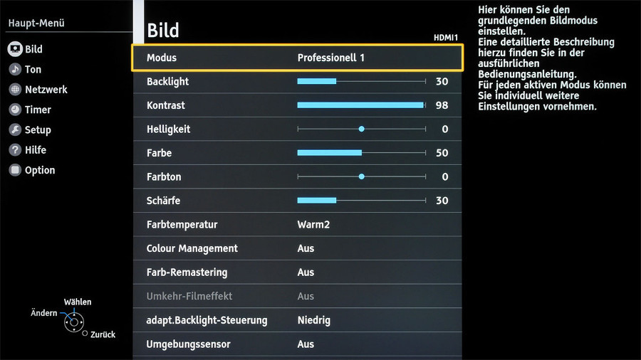 Die dafür verantwortliche „adaptive Backlight-Steuerung“ sollte in Einstellung „Niedrig“ betrieben werden, da die höheren Stufen düstere Filmszenen absaufen lassen. Gänzlich perfekt ist sie dennoch nicht, auch wenn weiße Schrifteinblendungen knackscharf und ohne Halo-Effekte dargestellt werden. So sind beispielsweise die Sterne zu Beginn von „Gravity“ lediglich in einem schmalen Streifen neben der Erde sichtbar, zum Rand hin verschwinden sie vollständig. Wechselt man im Menü „Backlight-Schwarzwert“ vom Preset „Dunkel“ auf „Normal“ oder „Hell“, lässt sich das Problem beheben.