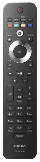 Gefallen hat uns an der Fernbedienung, dass sie so komfortabel zu benutzen ist, gut in der Hand liegt und sich alle Tasten bequem erreichen lassen. Ändern würden wir die Anordnung der Tasten für die Quellauswahl und für die Bildeinstellungen, die Philips leider unter dem numerischen Feld auf Höhe der „0“ platziert hat. Diese Bedienknöpfe sollten unserer Meinung nach aus rein praktischen Gründen näher am Navigationsrad liegen.