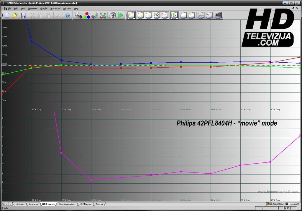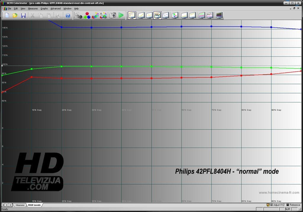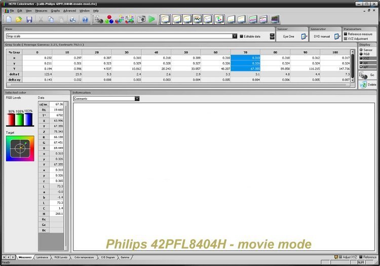 Da wir beim Philips 42PFL8404H auf den Weißabgleich und die Gammakorrektur verzichteten müssen, kalibrierten wir das Testgerät, indem wir die Einstellungen im Modus „Movie“ optimieren und erreichen dadurch die besten Ergebnisse. Das Diagramm vor der Kalibrierung (Normalmodus) zeigt Rot bei 87 %, Grün bei 98 % (dem Optimalwert am nächsten) und Blau bei 143 %, bei einer Helligkeit von 70 %. Nach der Kalibrierung erhielten wir weitaus einheitlichere Farbwerte: Rot bei 98 %, Grün bei idealen 100 % und Blau bei 103 %.