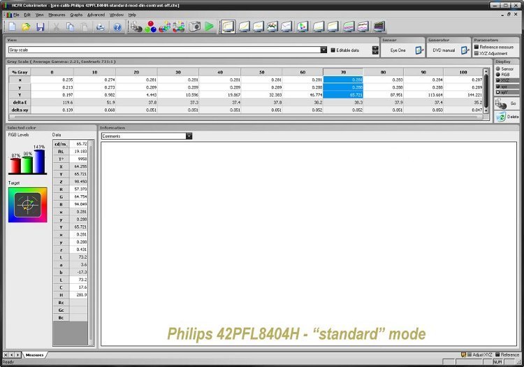 Die Koordinaten für den angestrebten Referenzwert D65 liegen bei: x = 0,313, y = 0,329. Vor der Kalibrierung lagen die Werte bei x = 0,281, y = 0,288 mit 70 IRE, nachher befanden sie sich bei x = 0,310, y = 0,326 – dem gesuchten D65 deutlich näher. Viele Tester benutzen 100 IRE, wir aber lehnen dies aus praktischen Gründen ab: die Mehrheit der Inhalte, die wir alle zu sehen bekommen, bewegt sich zwischen 50 und 80 IRE.