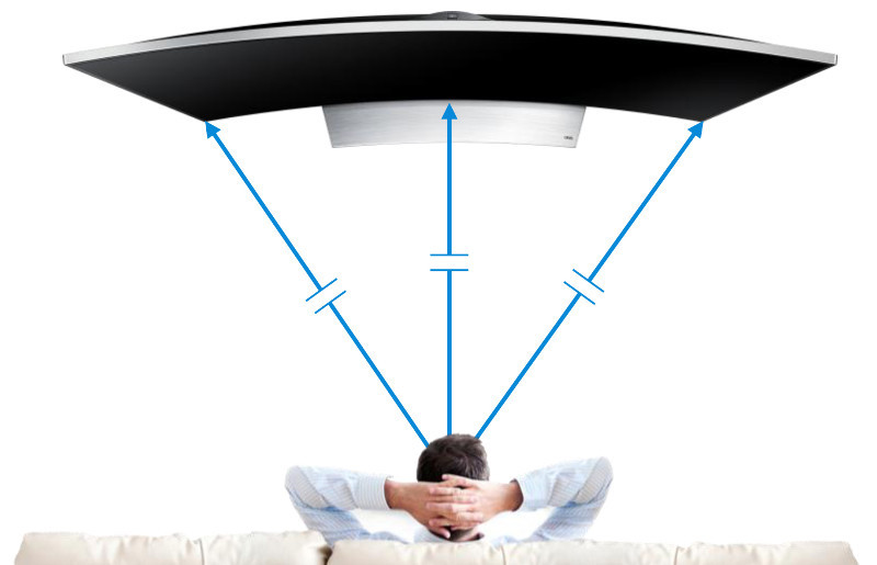 Was bringt die Krümmung (Curved)? Die wohl wichtigste Frage wollen wir gleich zu Beginn beantworten: Der im Radius von 4,2 Metern gebogene Bildschirm verspricht eine echte Kinoatmosphäre, da dieser das menschliche Gesichtsfeld gegenüber einem herkömmlichen Fernseher mit gleicher Bildbreite weiter abdeckt und durch den optimierten Abstand auch jeder Pixel gleich groß erscheint.
