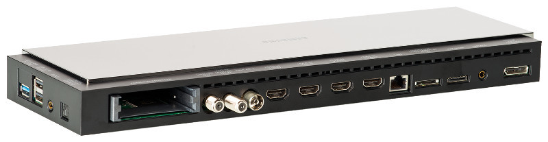Sämtliche Anschlüsse wurden dabei in die externe One-Connect-Box ausgelagert, die über ein rund drei Meter langes Spezialkabel mit dem TV-Gerät verbunden wird. Mit an Bord sind neben den eingangs erwähnten HDMI-2.0-Eingängen ein Twin-Tuner für alle gängigen Empfangswege samt USB-Recorder sowie zweier CI+-Slots.