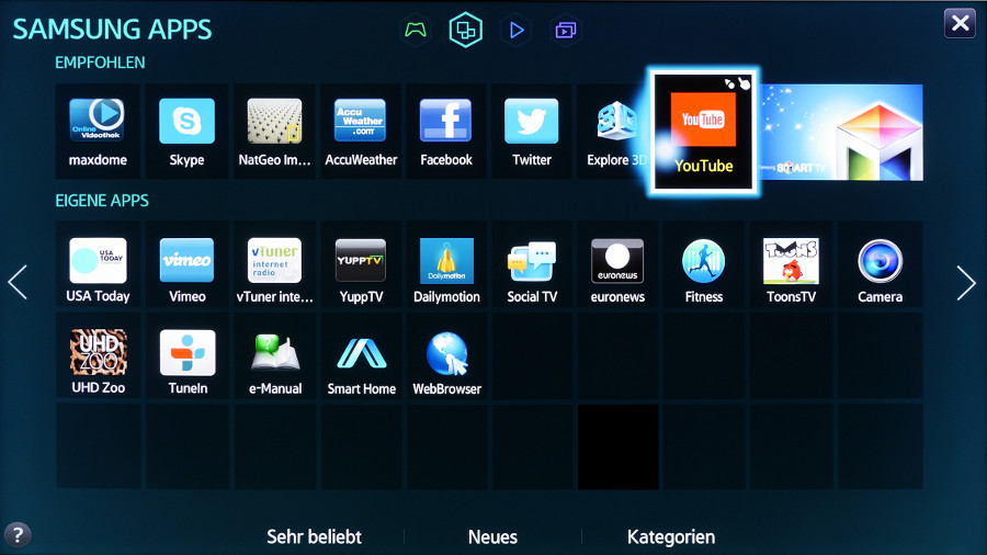 Das bewährte Smart-Hub-Portal wartet mit einem üppigen Multimedia-Angebot auf. Die Neuerungen gegenüber früheren Samsung-Modellen halten sich allgemein zwar in Grenzen, doch zeigt die YouTube-App nun Videos endlich und immerhin in 1080p- statt (wie bisher) in magerer 720p-Qualität. Darüber hinaus stehen noch viele weitere Apps zur Verfügung – angefangen bei Nachrichten- und Wetterportalen über Online-Videotheken bis hin zu sozialen Netzwerken.