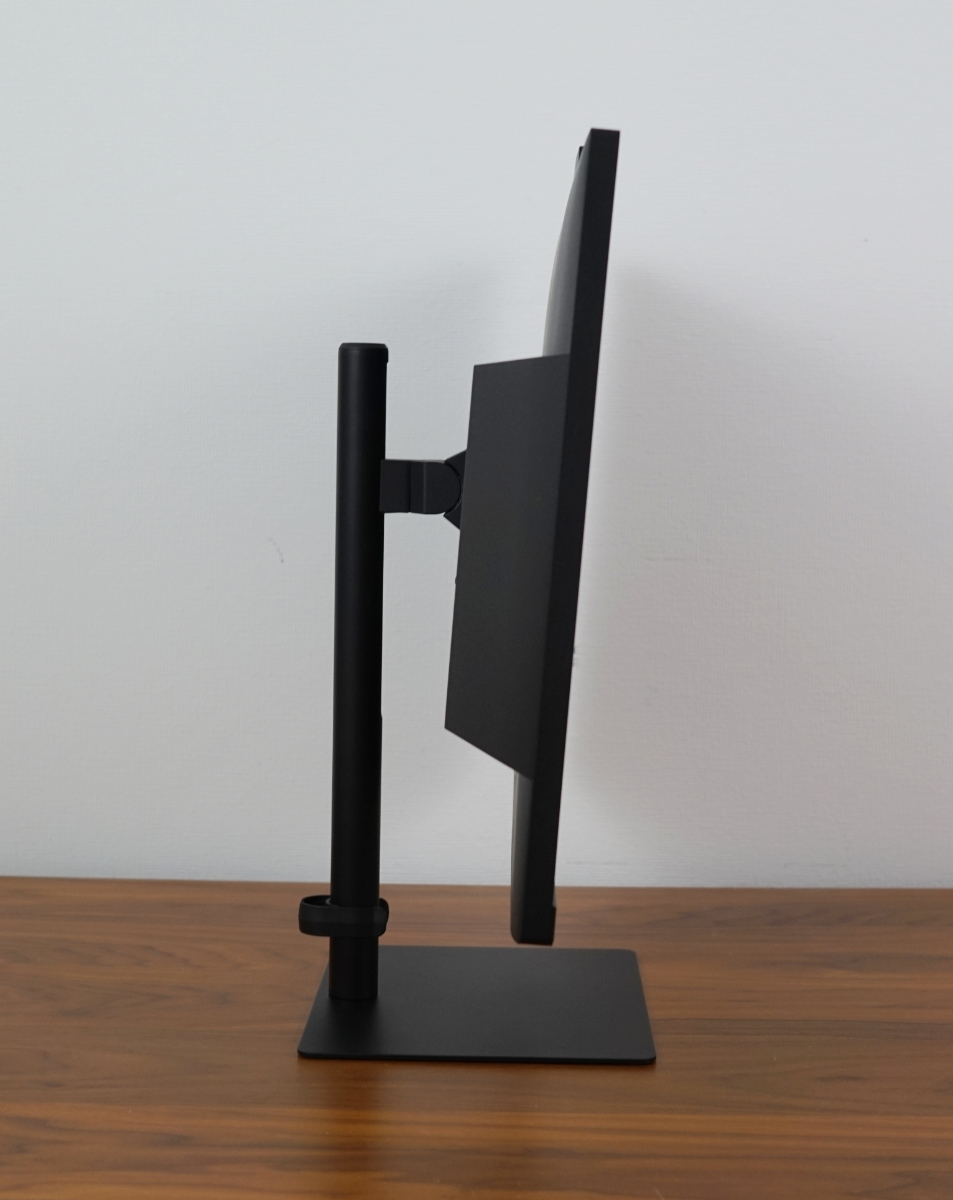 Auch das Schwenken um 90° ins Hochformat (Pivot) erfolgt präzise und mit geringem Kraftaufwand. Die Rotation ist nach rechts und links möglich. Da es einen Anschlagpunkt gibt, ist keine Rotation um die eigene Achse möglich. Allerdings muss das Display etwas nach hinten geneigt werden, da sonst die Ecke des Rahmens mit dem Standfuß kollidiert.