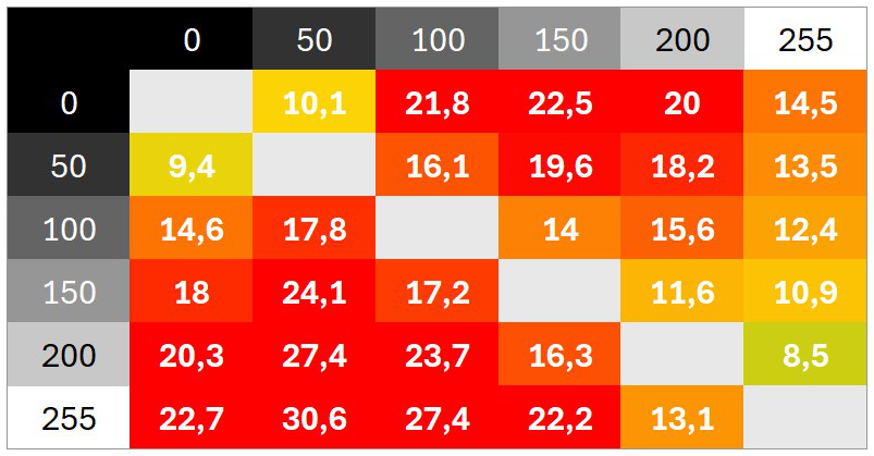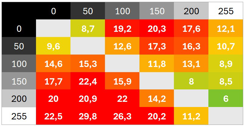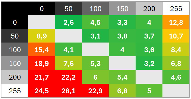 In der höchsten Overdrive-Stufe „Ultraschnell“ messen wir den Schwarz-Weiß-Wechsel (0–255) mit 12,8 ms sogar leicht verschlechtert und den schnellsten Grauwechsel mit 2,6 ms. Damit wird der im Datenblatt genannte Wert von 4 ms deutlich unterboten. Der Mittelwert über alle Messpunkte liegt bei 9,4 ms. Insgesamt verbessern sich die Messwerte stark, aber nicht alle.