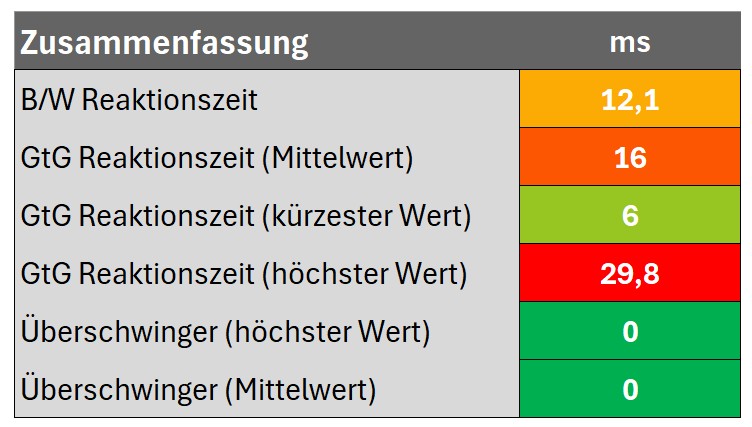 In der mittleren Overdrive-Stufe „Erweitert“ messen wir den Schwarz-Weiß-Wechsel (0–255) mit 12,1 ms leicht verbessert und den schnellsten Grauwechsel mit 6 ms. Der Mittelwert über alle Messpunkte liegt bei 16 ms. Insgesamt verbessern sich die Messwerte nur geringfügig.