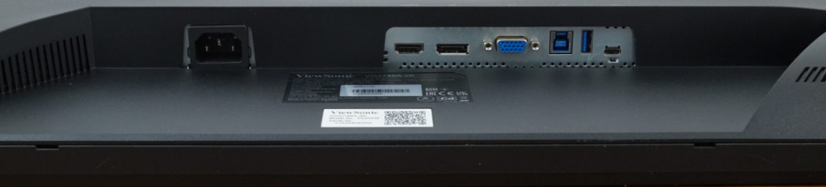 Bei den Signaleingängen bietet der ViewSonic-Testkandidat HDMI 2.0, DisplayPort, VGA, einen USB-C-3.2-Downstream (15 Watt Power Delivery), drei USB-A-3.2-Downstreams und einen USB-b-3.2-Upstream. Im Übrigen gibt es einen Stromanschluss für das interne Netzteil.