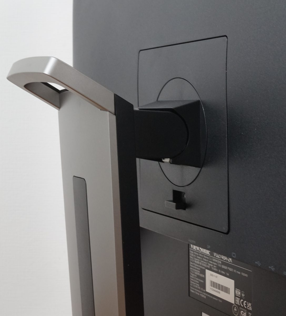 Anschließend wird die Standfußkonstruktion auf der Display-Rückseite eingeschoben und nach unten gedrückt, bis sie einrastet. Für eine sichere Montage belässt man den Monitor im Karton. Anschließend kann der fertig montierte ViewSonic VG2748A-2K bequem angehoben werden. Um den Arm wieder zu lösen, muss lediglich der dafür vorgesehene Schalter nach oben gedrückt werden.