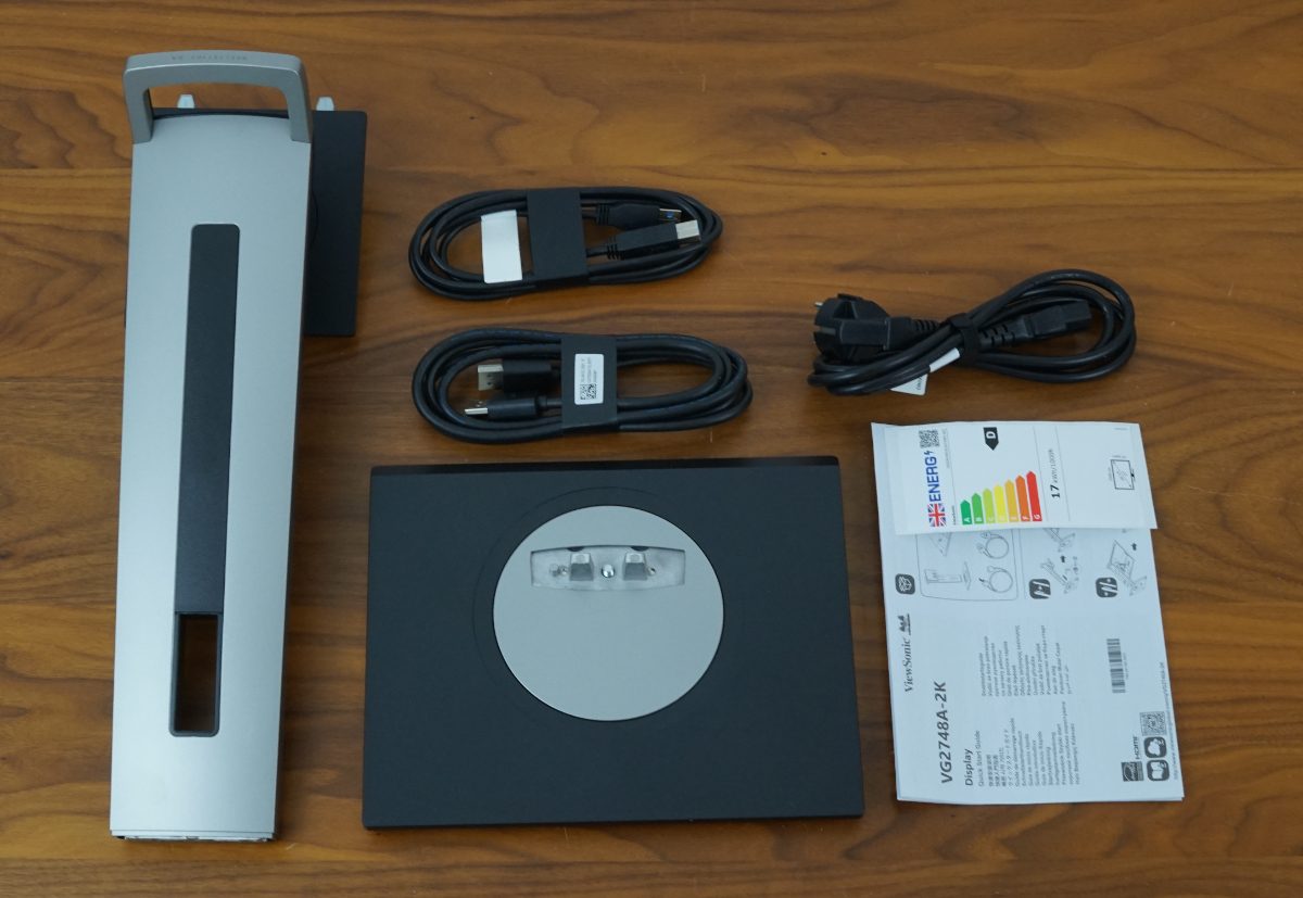 Neben dem ViewSonic VG2748A-2K selbst befinden sich der Standfuß, der Monitorarm sowie je ein Kabel für DisplayPort, USB-B auf USB-A und Strom im Karton. Außerdem liegen ein EU-Energielabel (Energieeffizienzklasse F) und eine Schnellstartanleitung bei.
