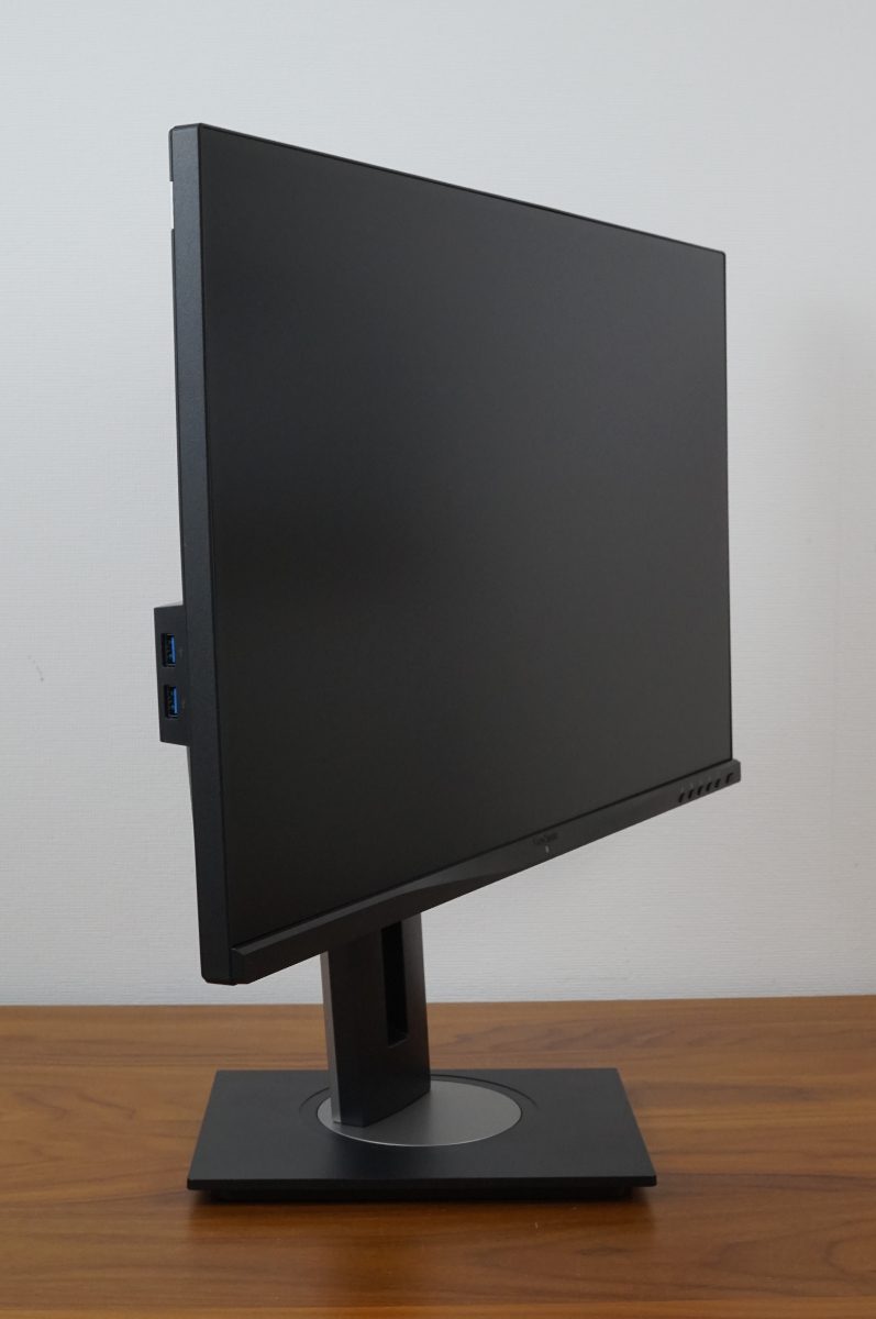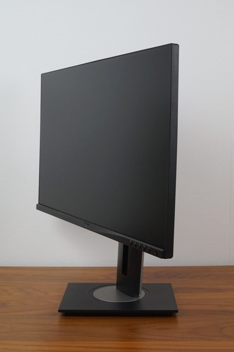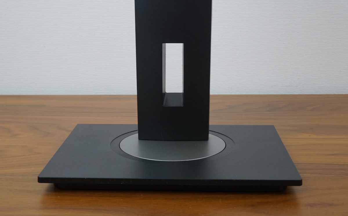 Auch das Schwenken um 90° ins Hochformat (Pivot) erfolgt präzise und mit geringem Kraftaufwand. Die Rotation ist nach rechts und links möglich. Da es einen Anschlagpunkt gibt, kann keine Rotation um die eigene Achse erfolgen. Allerdings muss das Display etwas nach hinten geneigt werden, da sonst die Ecke des Rahmens mit dem Standfuß kollidiert.