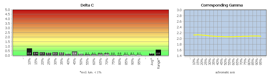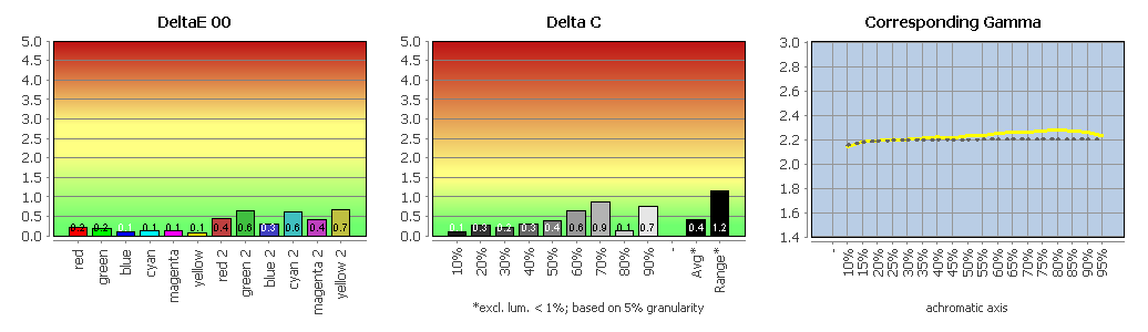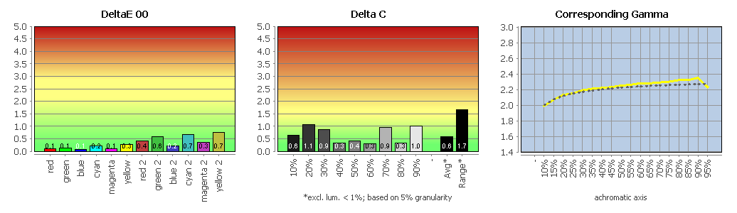 Die Graubalance ist gut (Delta-C-Average: 0,58). Die Range liegt bei 1,67 Delta C, was ebenfalls als gut zu werten ist. Die Farbwerte sind sehr gut (Delta-E-2000-Average: 0,38). Der Gammawert beträgt im Schnitt 2,23, und die Gammakurve verläuft weitestgehend korrekt. Die maximale Farbabweichung beläuft sich auf ein Delta E 2000 von 0,88 (RGB: 0 191 255).