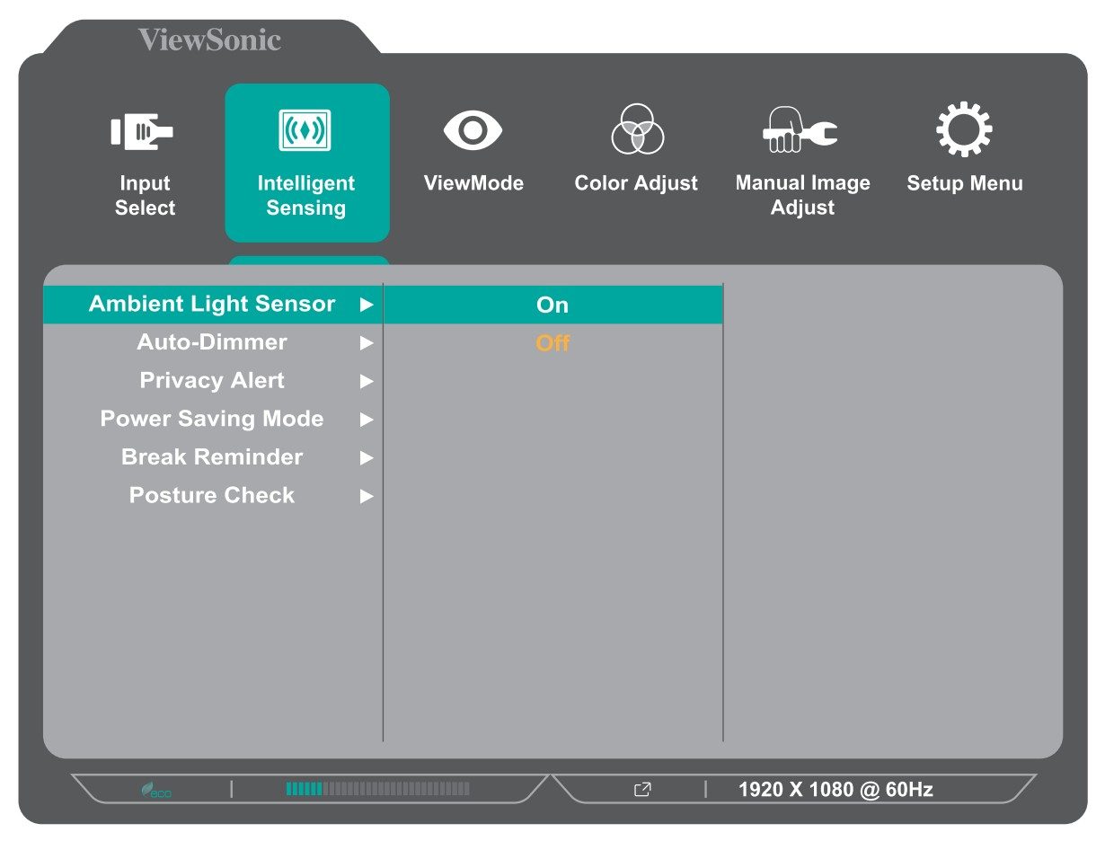 Der Sensor passt die Bildschirmhelligkeit automatisch an die Lichtverhältnisse der Umgebung an. Die Helligkeit kann manuell eingestellt oder vom Monitor automatisch vorgenommen werden.