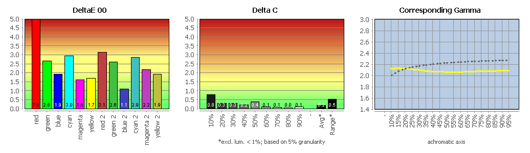 Mangels sRGB-Modus wird für die Messungen die Abstimmung ab Werk herangezogen. Bei der Graubalance (Delta-C-Average: 0,18; Delta-C-Range: 0,53) sind die Ergebnisse ausgezeichnet und bei den Farbwerten (Delta-E-2000-Average: 2,35) befriedigend. Die Maximalabweichung liegt bei hohen 7,75 Delta E 2000 (RGB: 255 0 0). Der Gammaverlauf beträgt im Schnitt 2,09 und verläuft nicht normgerecht.