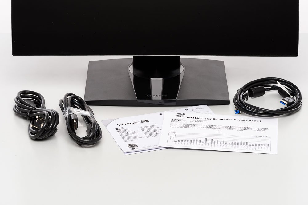 Der Lieferumfang beschränkt sich auf das Notwendigste, um das Gerät in einer Standard-Umgebung sofort in Betrieb nehmen zu können. Neben dem Stromkabel sind auch Kabel für den DisplayPort-Eingang und den USB-Hub enthalten. Da der Proband ab Werk vorkalibriert ist, liegt ein entsprechender Report bei.