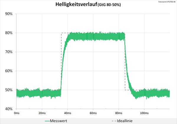 Die Hintergrundbeleuchtung des ViewSonic VP2756-4K arbeitet mit W-LED und leuchtet kontinuierlich. Der Vergleich im Diagramm zeigt: Sowohl bei voller als auch bei reduzierter Einstellung der Helligkeit wird der Lichtstrom nicht unterbrochen, wie das bei PWM-Backlights der Fall wäre. Somit ist der Bildschirm selbst bei reduzierter Helligkeit für ein längeres Arbeiten geeignet.
