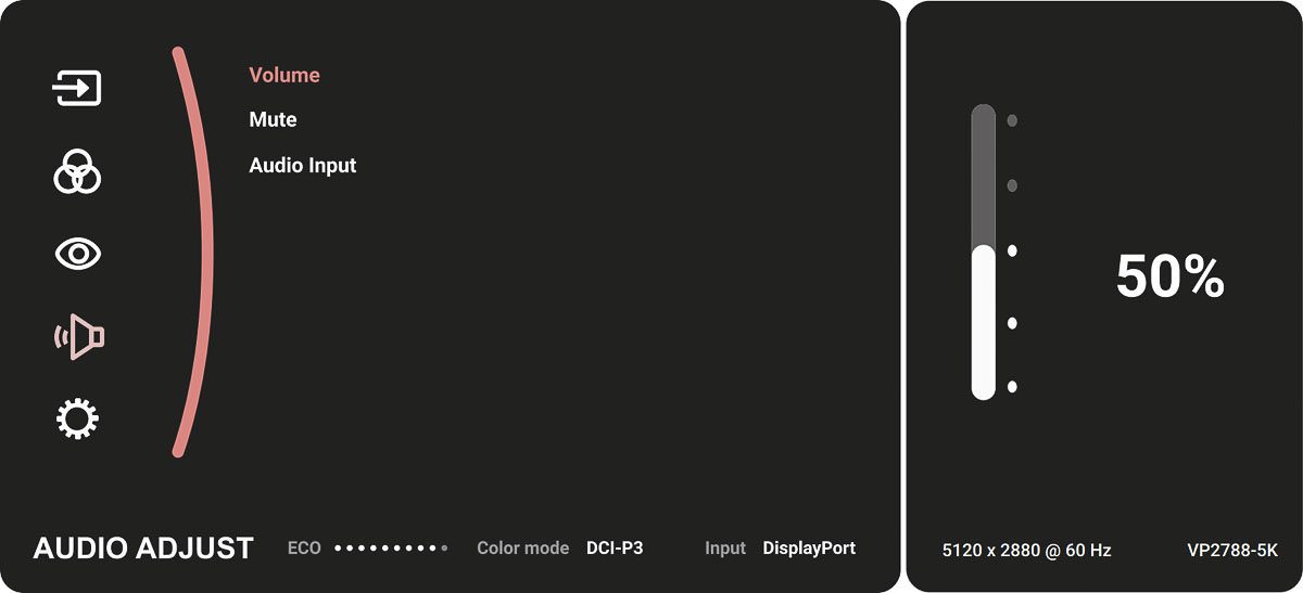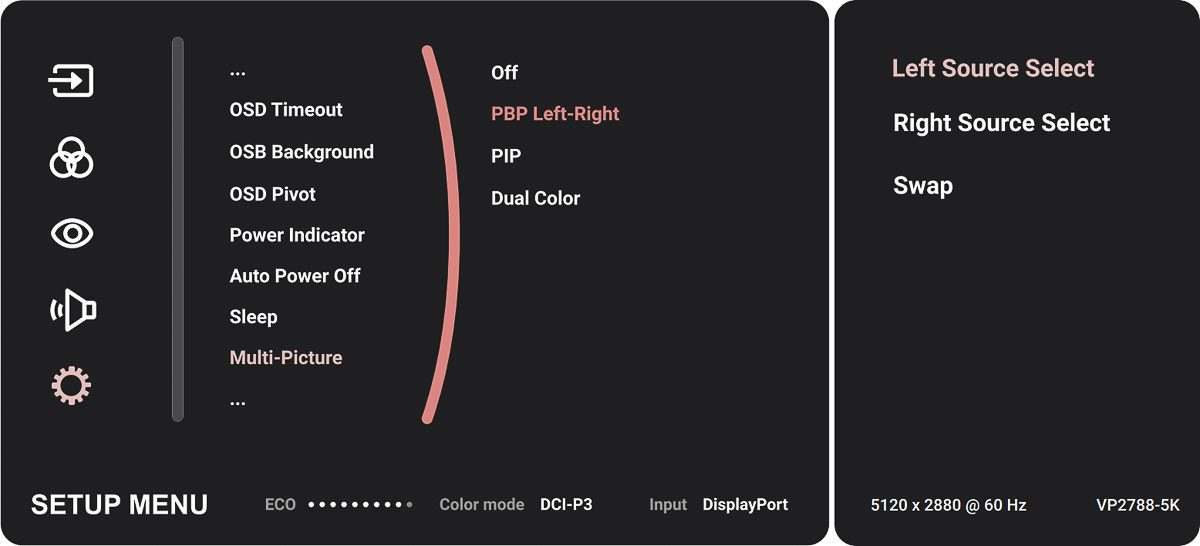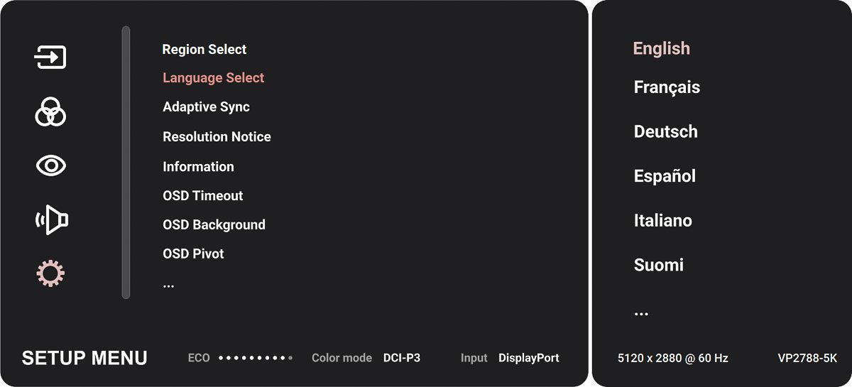 Das OSD des ViewSonic VP2788-5K entspricht im Grundaufbau dem des ViewSonic VP2776, das gegenüber früheren Generationen eine deutliche Überarbeitung erfahren hatte. Im Vergleich zu älteren ViewSonic-Menüs mit horizontal angeordneten Hauptkategorien wirkt die aktuelle Version klar strukturierter und zeitgemäßer.
