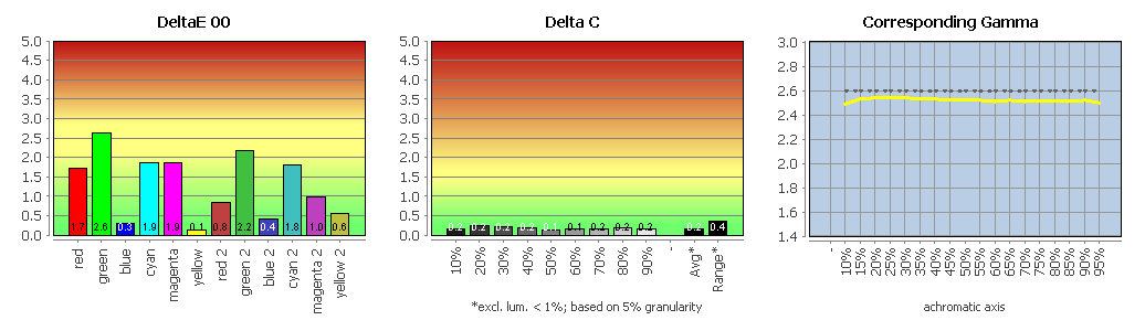 Die Erläuterungen zu den folgenden Charts haben wir für Sie zusammengefasst: Delta-E-Abweichung für Farbwerte und Weißpunkt, Delta-C-Abweichung für Grauwerte, und Gradation.