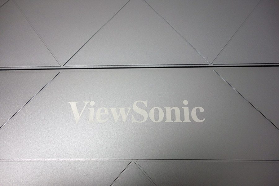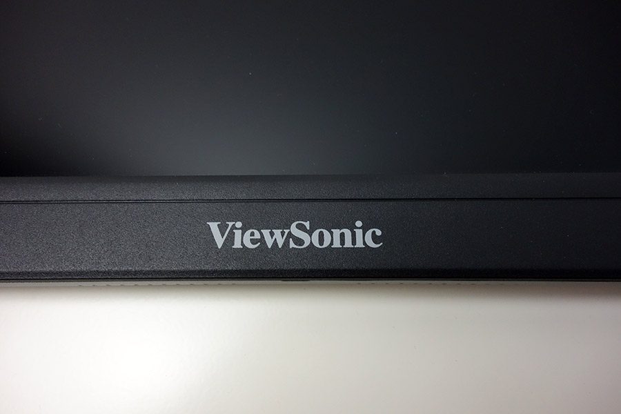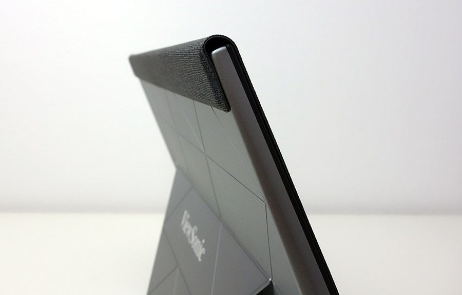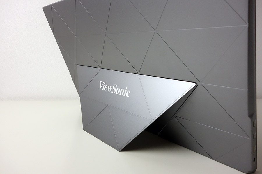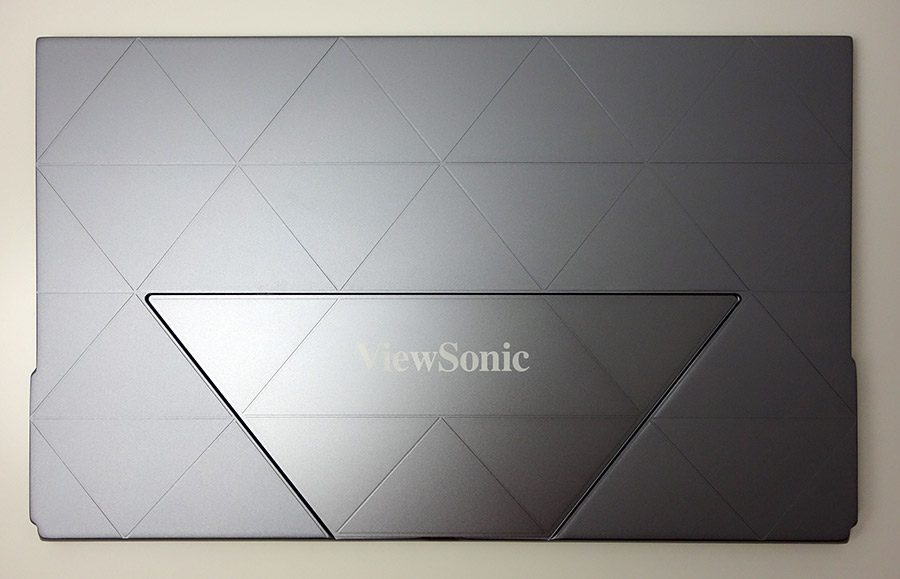 Von vorn präsentiert sich der portable Monitor ViewSonic VX1755 einheitlich schwarz. Dieser Teil des Gehäuses besteht aus Kunststoff, die Oberfläche ist leicht rau, und an drei Seiten ist der Rahmen um das Display nur 6 mm breit – am unteren Display-Rand sind es 24 mm. Die Gehäuserückseite ist hingegen silberfarben gehalten und aus Metall. Die Oberfläche ist matt, und ein Dreieckmuster ist eingefräst. Optisch wie haptisch fühlt sich die Verarbeitung des Modells hochwertig an.