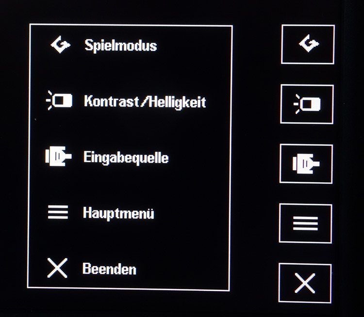Wenn bei geschlossenem OSD eine der vier Tasten gedrückt wird, erscheint auf dem Display neben der jeweiligen Taste ein Symbol, das die Funktion der Taste grafisch darstellt. Eine Textbeschreibung je Symbol gibt es noch zusätzlich.