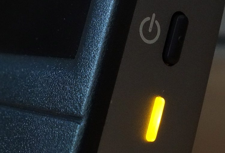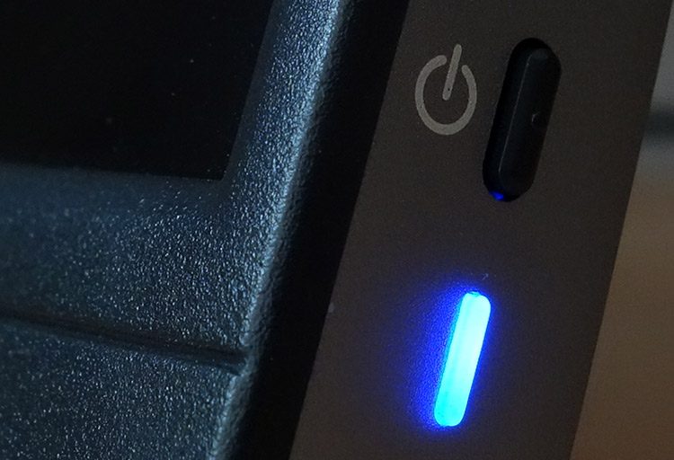 Unterhalb der Power-Taste befindet sich die Betriebsanzeige. Die LED leuchtet im Betriebszustand des Monitors blau und im Ruhemodus orange. Im OSD lässt sich die Betriebsanzeige deaktivieren, allerdings nur für den Betrieb, denn im Ruhemodus leuchtet die Betriebsanzeige immer orange.