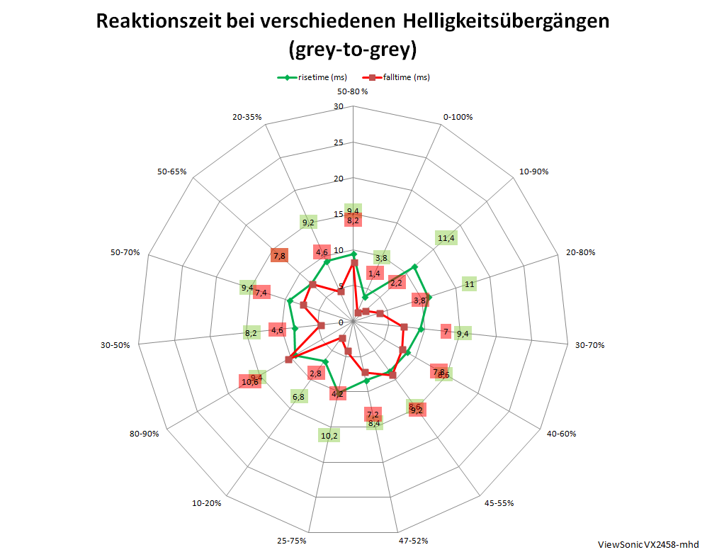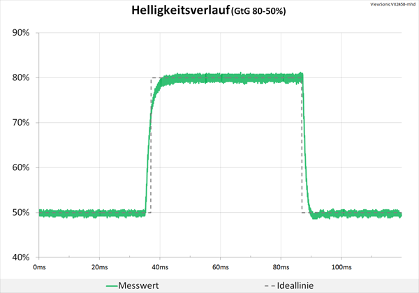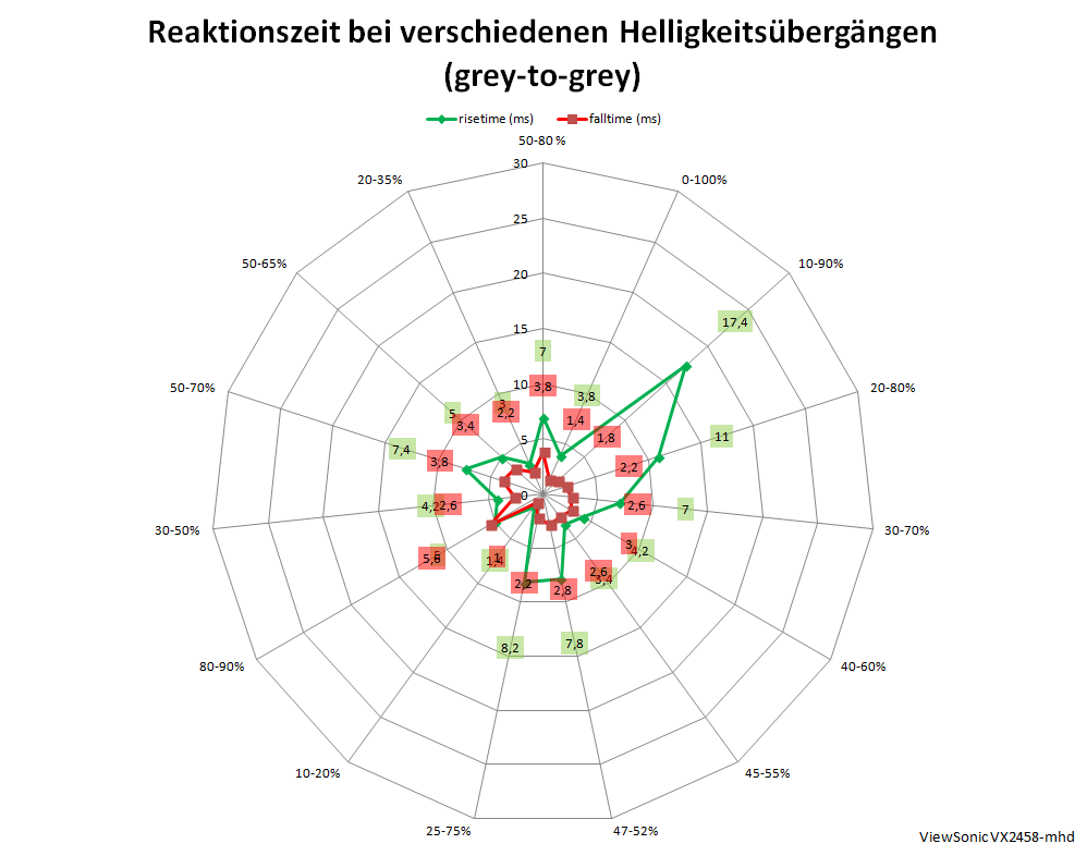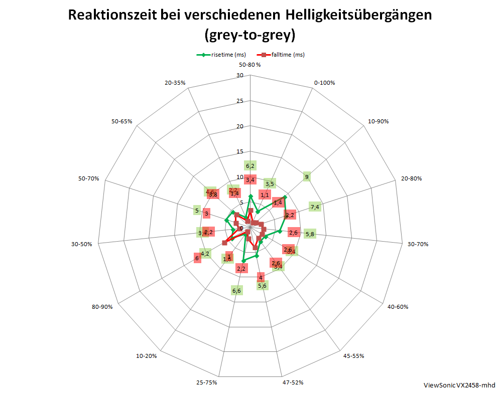 Die Latenz ist ein wichtiger Wert für Spieler, wir ermitteln sie als Summe der Signalverzögerungszeit und der halben mittleren Bildwechselzeit. Mit einer Signalverzögerung von superschnellen 1,2 ms und einer mittleren Bildwechselzeit von 3,4 ms errechnet sich eine Gesamtlatenz von 4,6 ms. Mit solchen Werten gehört der ViewSonic VX2458-mhd zu den schnellsten seiner Art und wird auch E-Sportler komplett überzeugen.
