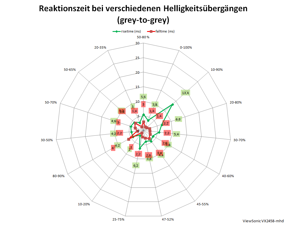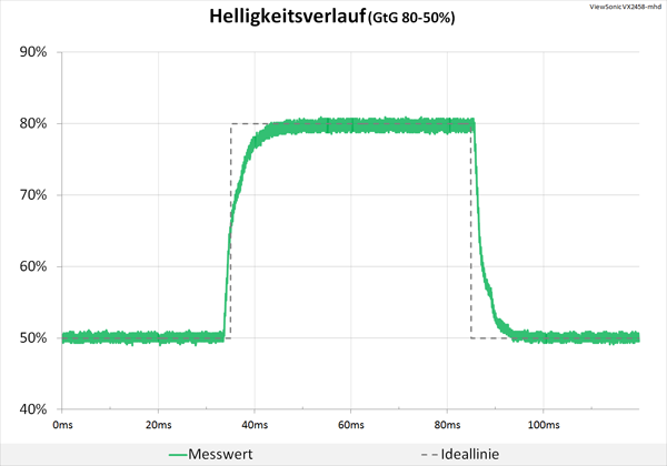 In der maximalen Einstellung des Overdrives kann man bis auf den Schwarz-Weiß-Wechsel erneut eine Verkürzung der anderen Schaltzeiten feststellen. Mit 2,4 ms für den schnellsten Grauwechsel, 6,7 ms für den Durchschnittswert an 15 Messpunkten und 3,6 ms für den CtC-Wert muss sich das ViewSonic-Modell nicht vor anderen Gaming-Displays verstecken. Ganz im Gegenteil: In Anbetracht des blitzsauberen Signals kann man den Monitor zu den Spitzengeräten seiner Art zählen.