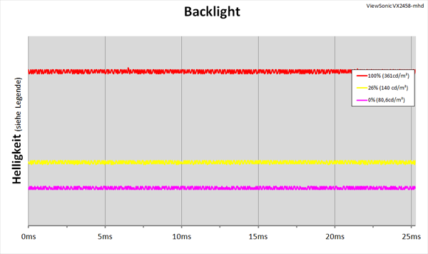 Die Hintergrundbeleuchtung des ViewSonic-Displays arbeitet mit White-LED und leuchtet kontinuierlich. Der Vergleich im Diagramm zeigt: Sowohl bei voller als auch bei reduzierter Einstellung der Helligkeit wird der Lichtstrom nicht unterbrochen, wie das bei PWM-Backlights der Fall wäre.