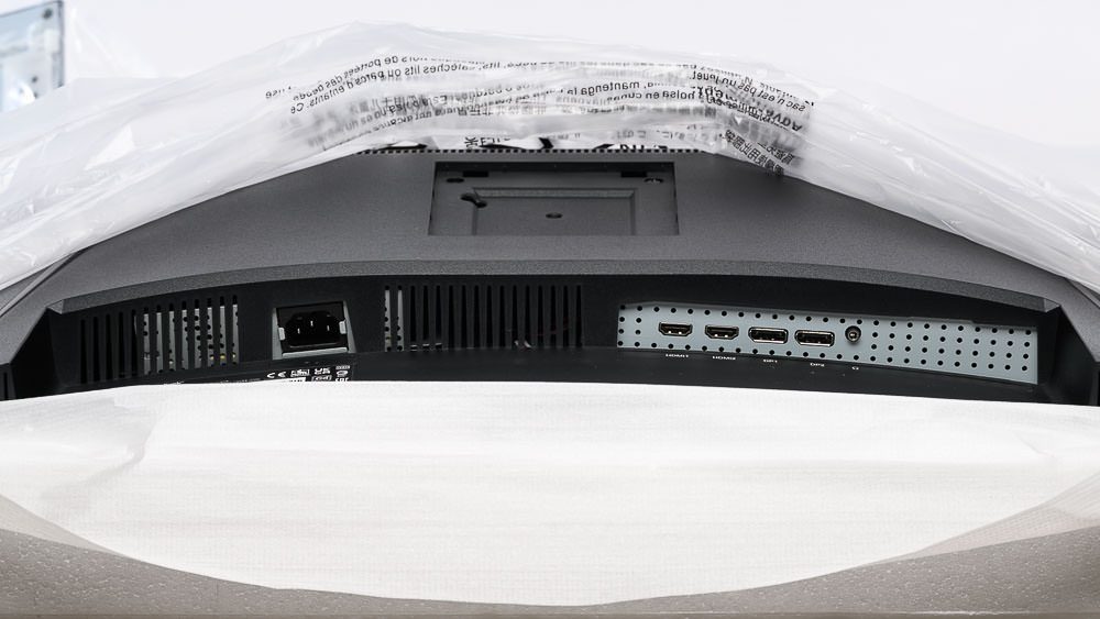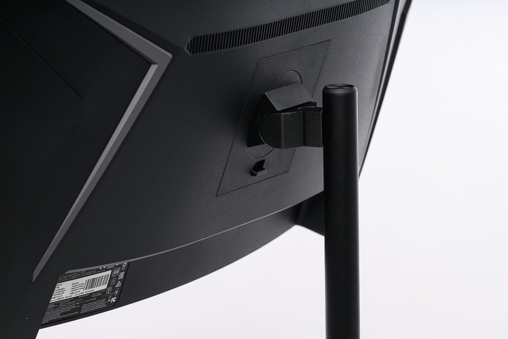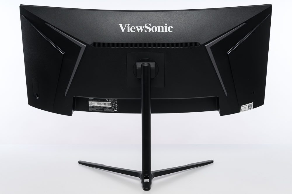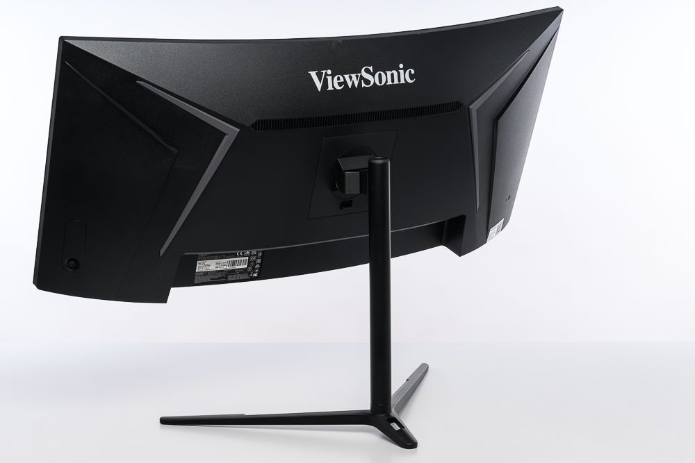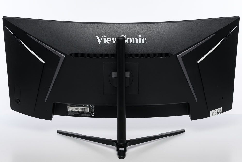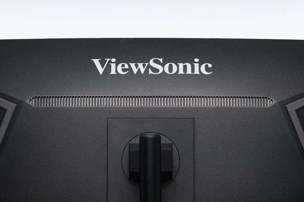 Vorn sorgen schmale Rahmen an drei Seiten für eine großzügige Bildwirkung, während die 1500-R-Krümmung das Sichtfeld leicht zusammenzieht und so ein geschlossenes Panorama erzeugt. Die Rückseite ist mattschwarz, leicht strukturiert und unempfindlich gegenüber Fingerabdrücken. Dezente graue Zierelemente lenken den Blick auf das mittig platzierte ViewSonic-Logo.