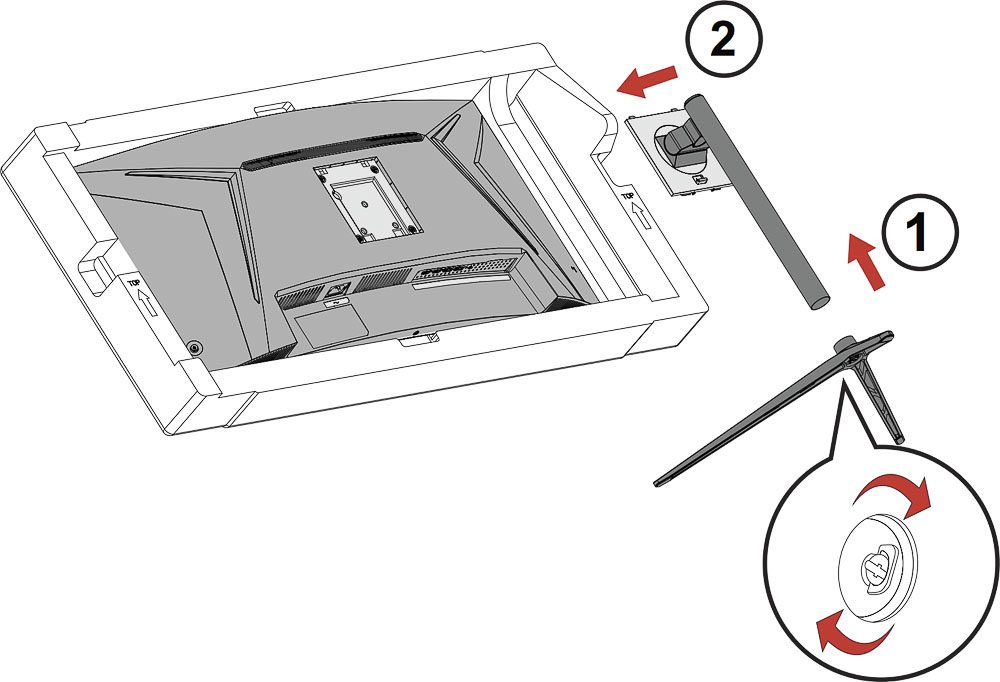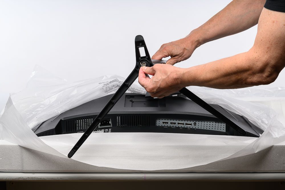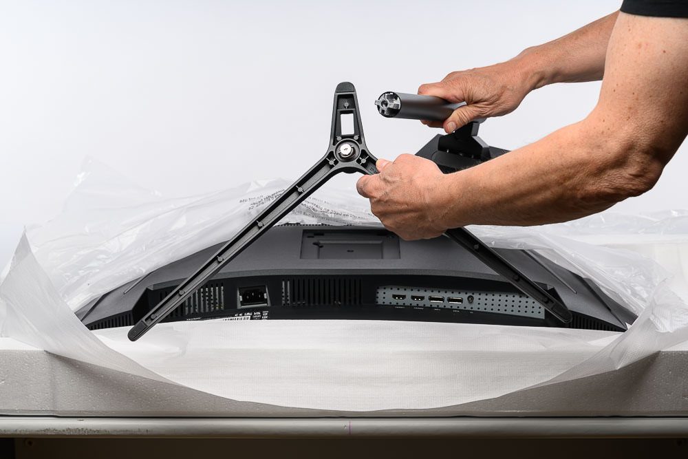 Nachdem man den Standfuß über eine Flügelschraube mit dem Standbein verbunden hat, wird das Standbein auf der Display-Rückseite eingeschoben, bis es hörbar einrastet. So kann man den Monitor recht leicht aus der schützenden Verschalung heben und auf den Schreibtisch stellen.