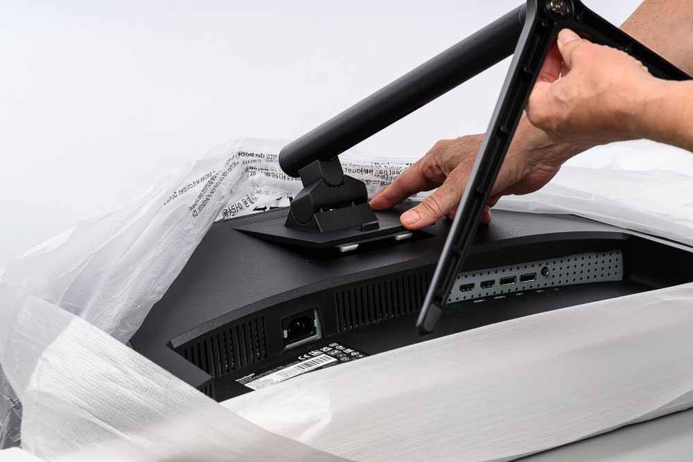 Die Montage kann direkt aus dieser Schutzverpackung heraus erfolgen – bei Curved-Panels ein wichtiger Punkt. Das Display sollte nicht mit der Front auf den Tisch gelegt werden, um unnötige Spannungen in der Wölbung zu vermeiden. Am einfachsten gelingt der Aufbau, solange die Styroporschalen das Gerät stabil halten. Die beiliegende Schnellstart-Anleitung veranschaulicht das Vorgehen.