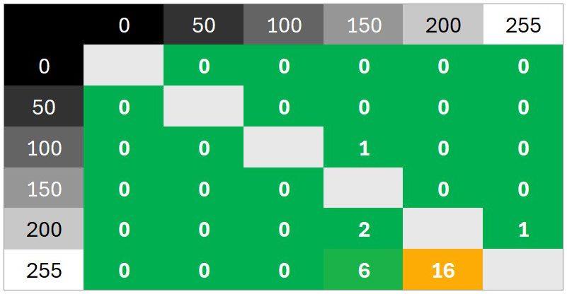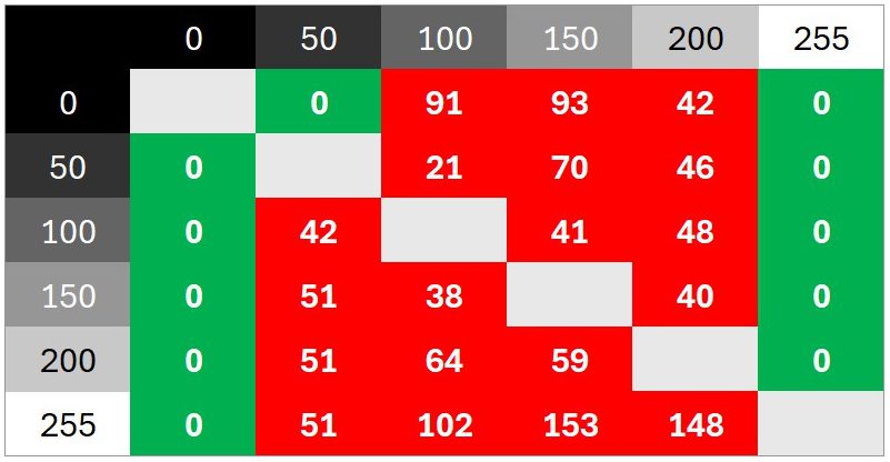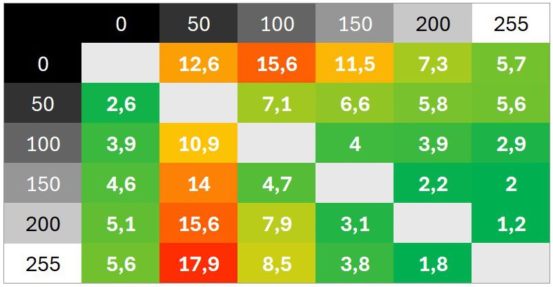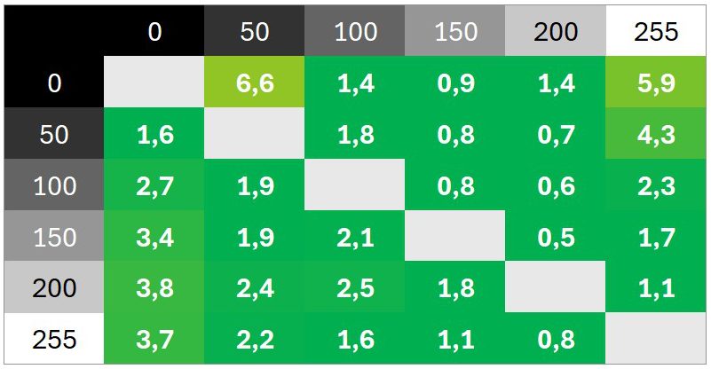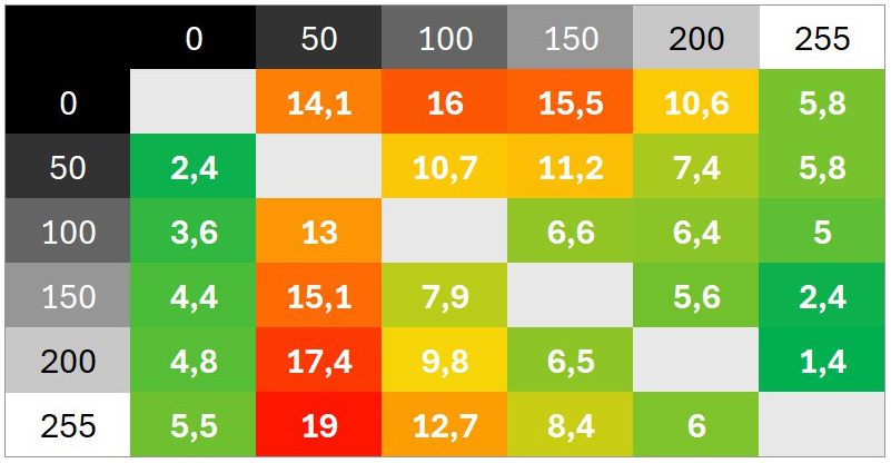 Überschwinger sind keine zu beobachten, die Abstimmung ist sehr neutral. Das Schaltzeiten-Diagramm zeigt unter anderem, wie sich verschiedene Helligkeitssprünge addieren und wie schnell der Monitor in der Werkseinstellung im besten Fall reagiert.