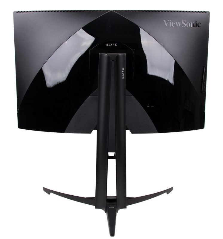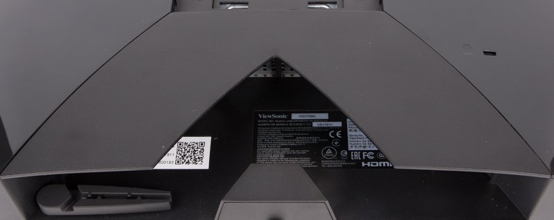 Die Rückseite des ViewSonic XG270QC zeigt oben rechts dezent das Herstellerlogo an. Auffälliger ist der große mittige Bereich, in dem sich unsere Softboxen deutlich spiegeln. Dieses Areal besitzt auch die angesprochene RGB-Beleuchtung, die wir in einem späteren Abschnitt genauer darstellen.