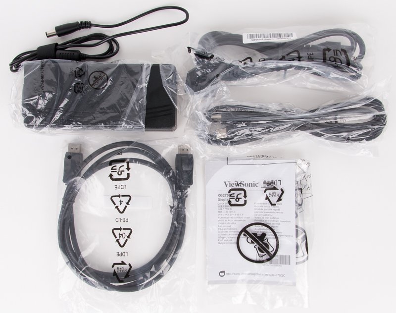 Der Lieferumfang des ViewSonic XG270QC wird durch ein großes Netzteil samt zusätzlichem Stromkabel dominiert. Die Abmessungen des reinen Netzteils betragen etwa 16,5 x 7,5 x 4 cm. Zusätzlich beigelegt wurden ein DisplayPort- und ein USB-3.0-Kabel. Eine Kurzanleitung rundet das Paket ab. Eine ausführliche Anleitung und auch eine Software zur Steuerung des OSDs und der RGBs können von der Hersteller-Homepage heruntergeladen werden.
