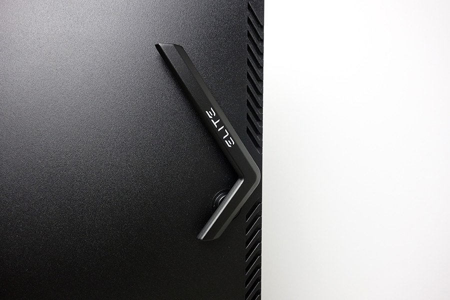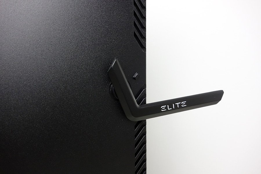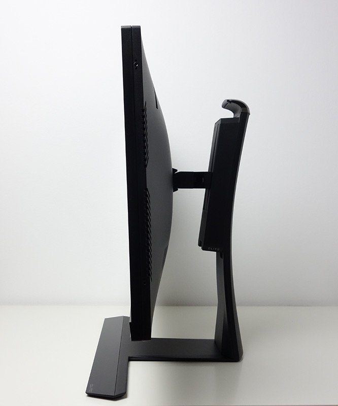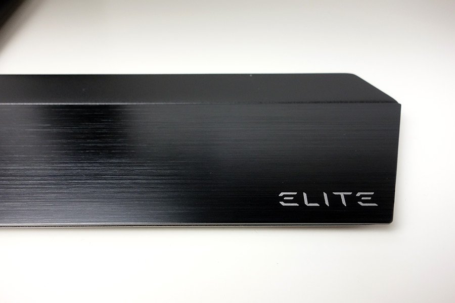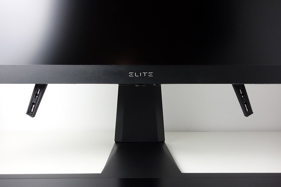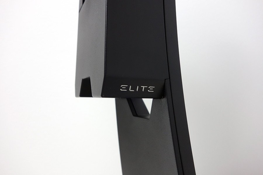 An vielen Stellen am Gehäuse und Standfuß ist die Modellbezeichnung ELITE zu lesen. So befindet sich am unteren Gehäuserahmen mittig platziert nicht wie meist üblich der Herstellername, sondern die Modellbezeichnung. Seitlich am Standfuß, am oberen Ende des Standfußes und am Standbein wiederholt sich der Schriftzug ELITE.