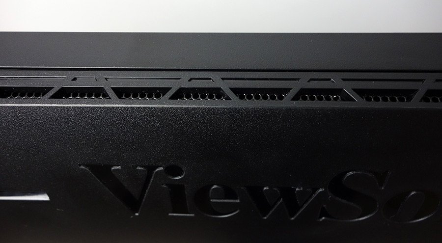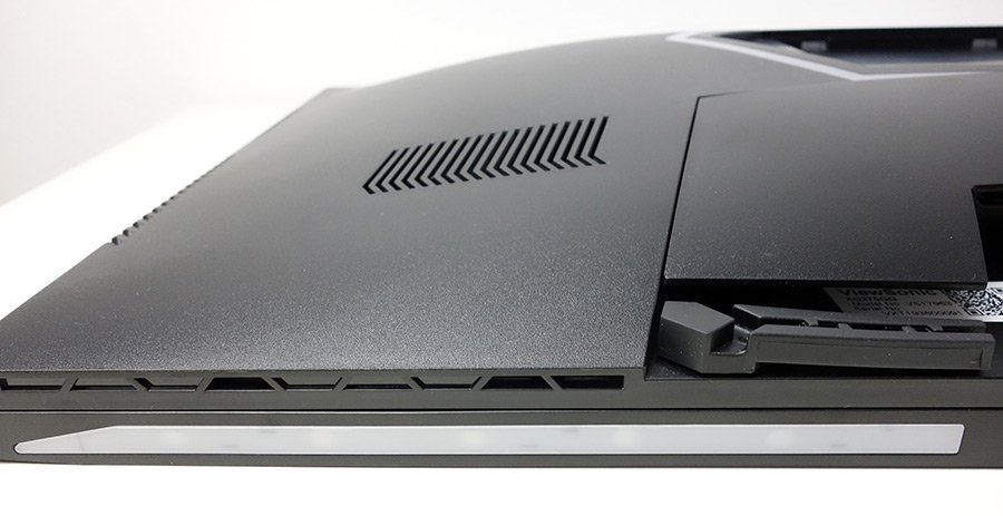 Auf der Gehäuserückseite ist im oberen Bereich der Herstellerschriftzug ViewSonic platziert. Links und rechts davon befinden sich zwei stylische Einkerbungen im Gehäuse, die aber lediglich eine optische Funktion haben. Um die Standfußhalterung herum ist die externe LED-Beleuchtung geführt, an der Gehäuseunterseite befinden sich auch noch zwei LED-Streifen. Alle Kunststoffteile sind sehr genau gefertigt und vermitteln eine hochwertige Verarbeitungsqualität.