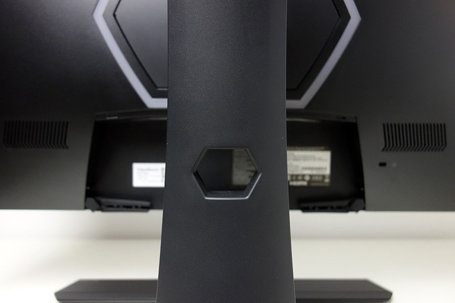 Unterhalb der Standfußhalterung befinden sich die VESA-Bohrungen mit Lochabstand von 100 mm. Die benötigten Montageschrauben sind bereits vorhanden. Damit lässt sich der ViewSonic XG270QG auch mit alternativen Halterungsmöglichkeiten verbinden.