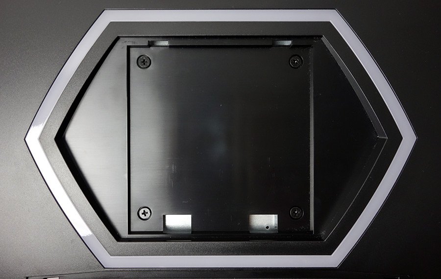 In der Form eines in die Breite gezogenen Sechsecks verläuft die externe LED-Beleuchtung um die Standfußhalterung herum. An der Gehäuseunterseite befinden sich noch zwei weitere LED-Streifen.