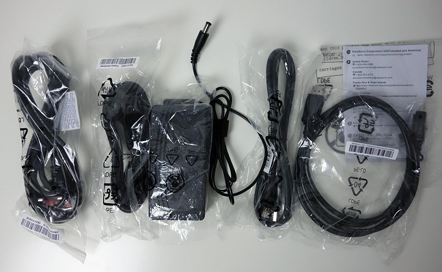 Zum Lieferumfang des ViewSonic XG270QG gehören DisplayPort-, USB-3.0-Hub- und 3,5-mm-Klinke-Kabel sowie ein externes Netzteil mit dem dafür benötigten Stromkabel. Da unser Testgerät aus England kommt, ist noch ein zusätzliches Stromkabel mit dabei. Besonderheit im Zubehör sind zwei seitliche Sichtschutzplatten für das Display, die in Schaumstoffbeutel verpackt sind. Bis auf das fehlende HDMI-Kabel ist alles dabei, was benötigt wird, um den Monitor vollumfänglich in Betrieb nehmen zu können.